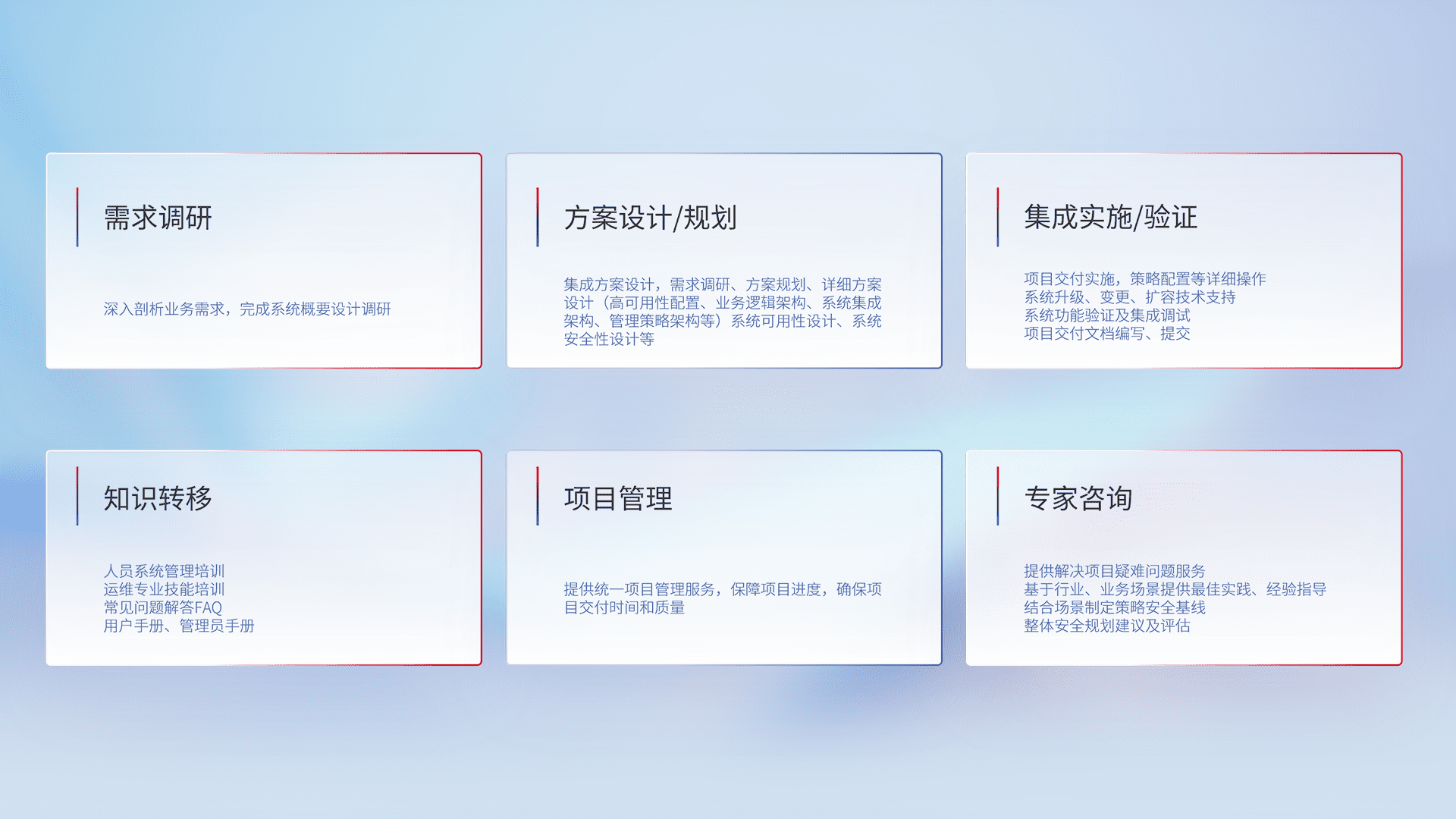 针对客户行业特性,,,将宏观的安全战略和需求,,,,通过专业的交付服务,,实现项目落地,,,,为客户提供标准规范的集成交付服务。。